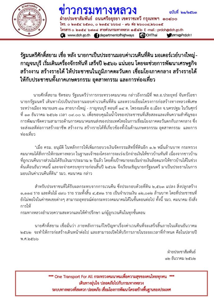 รัฐมนตรีศักดิ์สยาม เชื่อ หลัง นายกฯเป็นประธานมอบค่าเวนคืนที่ดิน มอเตอร์เวย์บางใหญ่-กาญจนบุรี เริ่มเดินเครื่องจักรทันที เสร็จปี 2566 แน่นอน