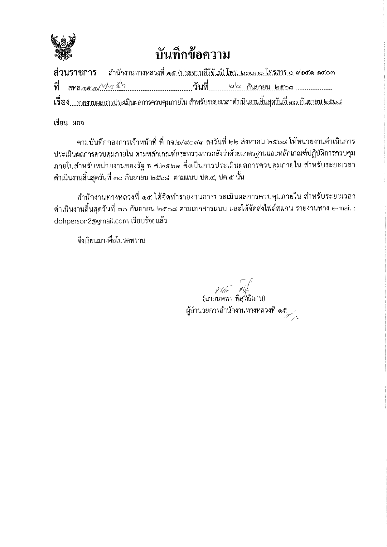 20 23/09/2568 รายงานผลการประเมินผลการควบคุมภายใน สำหรับระยะเวลาดำเนินงานสิ้นสุดวันที่ 30 กันยายน 2568