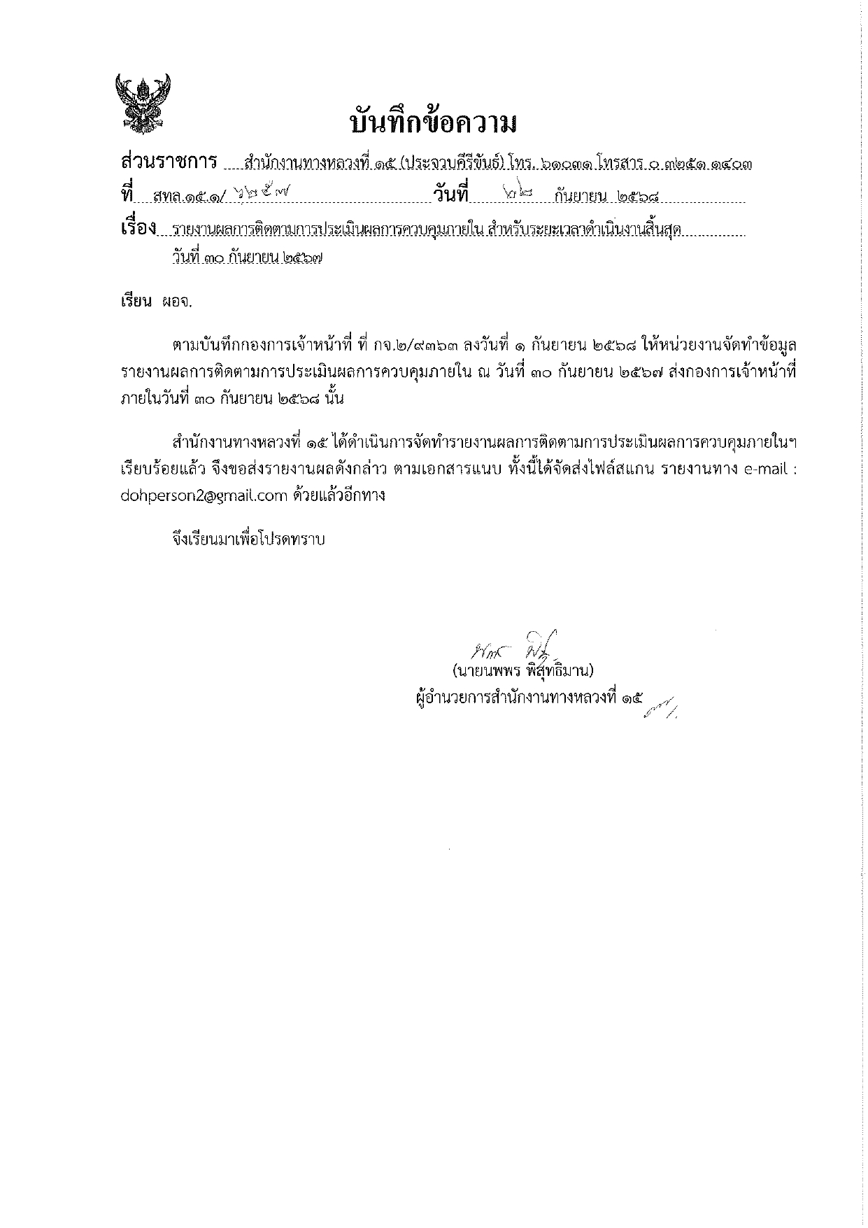 19 23/09/2568 รายงานผลการติดตามการประเมินผลการควบคุมภายใน สำหรับระยะเวลาดำเนินงานสิ้นสุดวันที่ 30 กันยายน 2568
