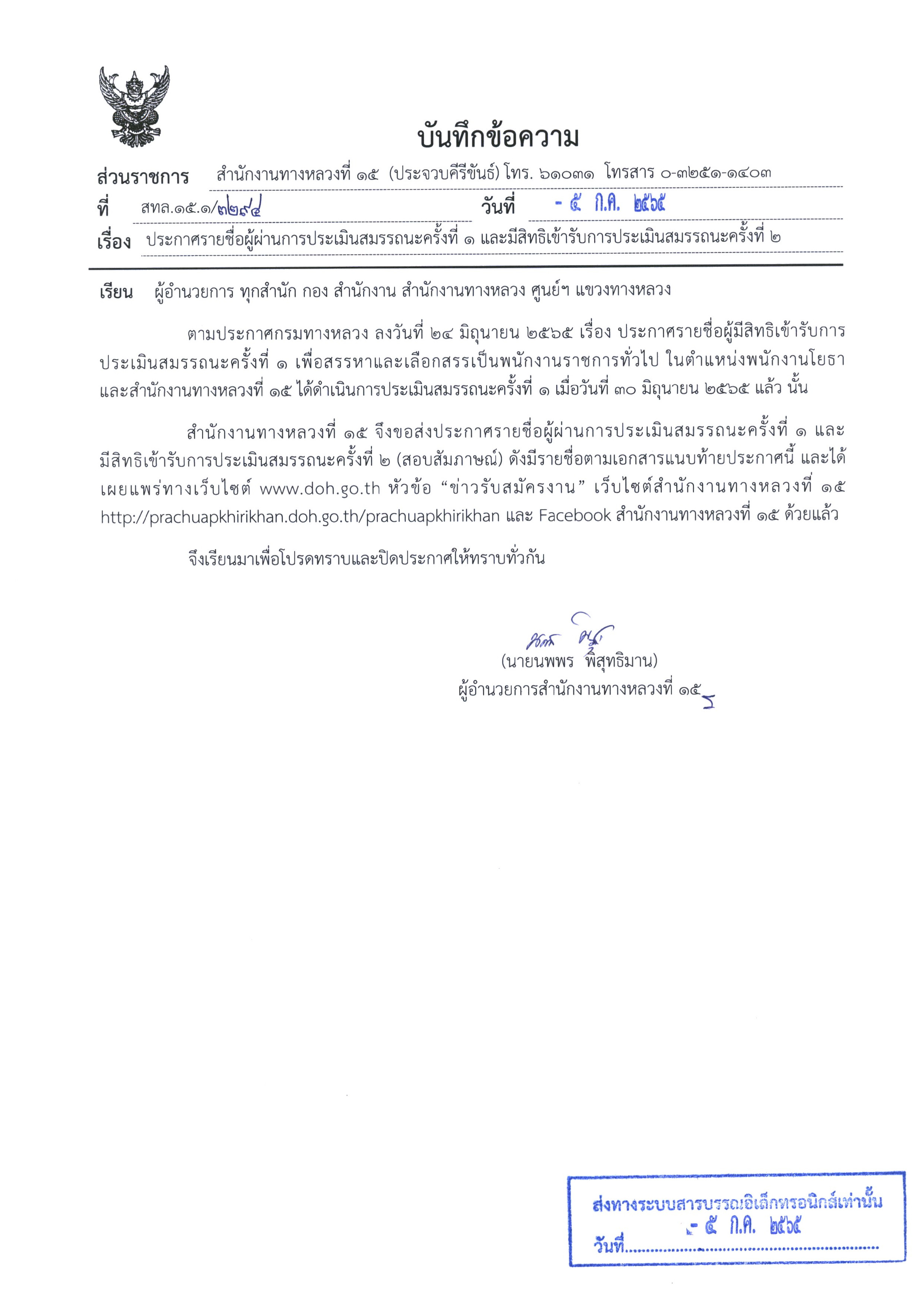 | ประกาศรายชื่อผู้ผ่านการประเมินสมรรถนะครั้งที่1 และมีสิทธิ์เข้ารับการประเมินสมรรถนะครั้งที่ 2 เพื่อเลือกสรรพนักงานราชการทั่วไป ตำแหน่งพนักงานโยธา จำนวน 2 อัตรา (ประกาศ ณ วันที่ 5 กรกฎาคม 65) | 350 | ดาวน์โหลด |