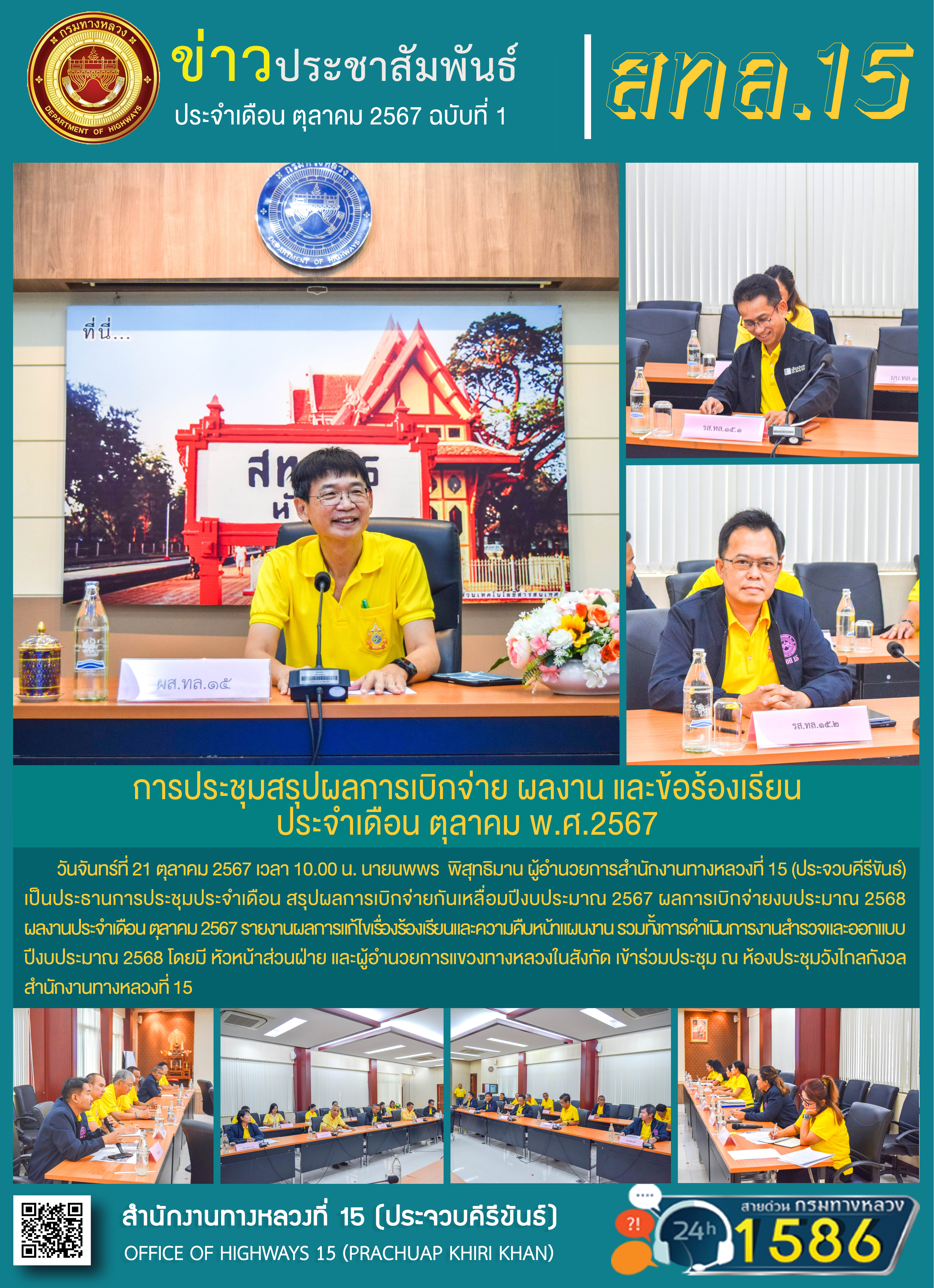 วันจันทร์ที่ 21 ตุลาคม 2567 เวลา 10.00 น. นายนพพร พิสุทธิมาน ผู้อำนวยการสำนักงานทางหลวงที่ 15 (ประจวบคีรีขันธ์) เป็นประธานการประชุมประจำเดือน สรุปผลการเบิกจ่ายกันเหลื่อมปีงบประมาณ 2567 ผลการเบิกจ่ายงบประมาณ 2568 ผลงานประจำเดือน ตุลาคม 2567 รายงานผลการแก้ไขเรื่องร้องเรียนและความคืบหน้าแผนงาน รวมทั้งการดำเนินการงานสำรวจและออกแบบปีงบประมาณ 2568 โดยมี หัวหน้าส่วนฝ่าย และผู้อำนวยการแขวงทางหลวงในสังกัด เข้าร่วมประชุม ณ ห้องประชุมวังไกลกังวล สำนักงานทางหลวงที่ 15