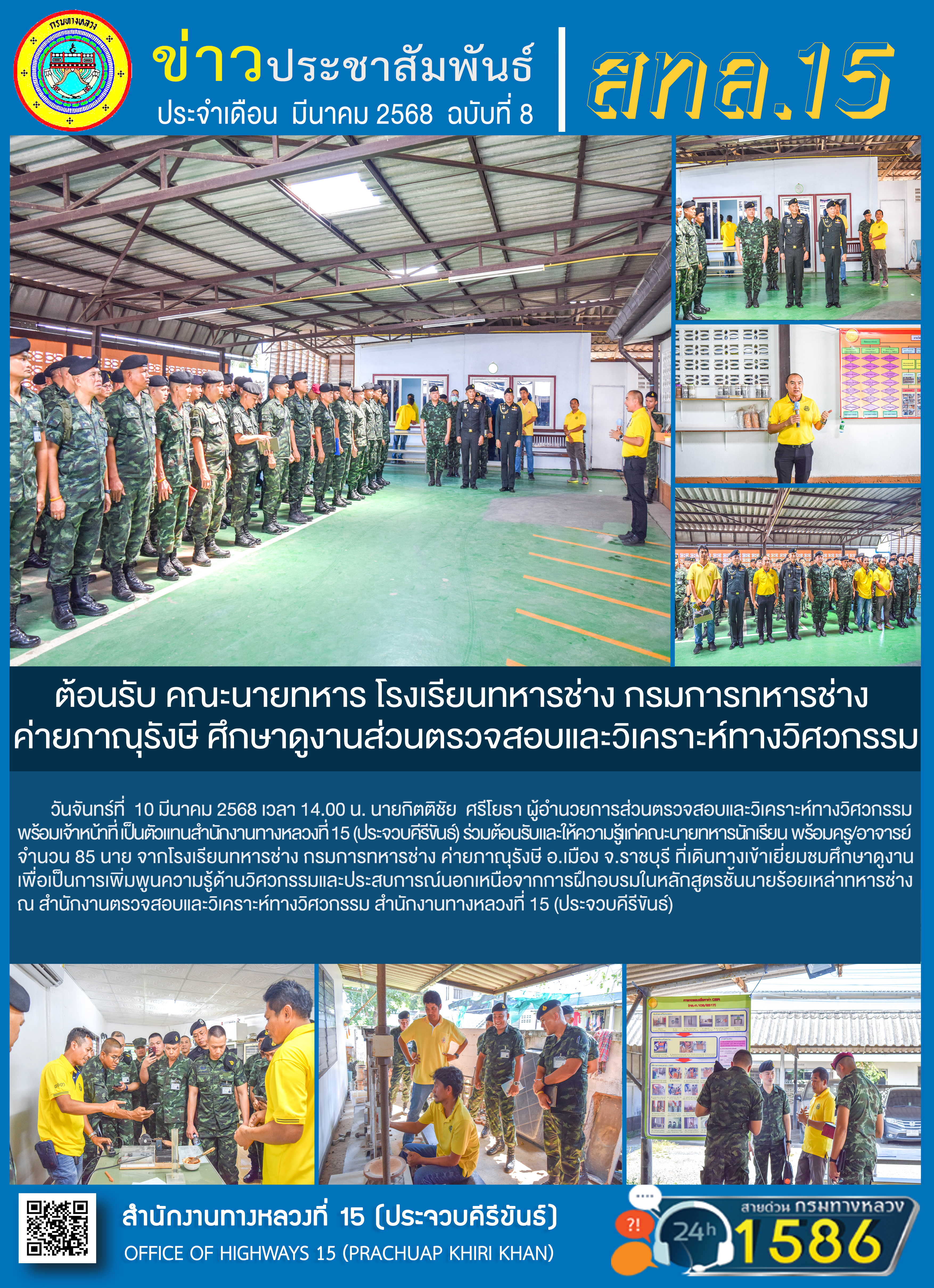 วันที่ 10 มีนาคม 2568เวลา 14.00 น. นายกิตติชัย ศรีโยธา ผู้อำนวยการส่วนตรวจสอบและวิเคราะห์ทางวิศวกรรม พร้อมเจ้าหน้าที่ เป็นตัวแทนสำนักงานทางหลวงที่ 15 (ประจวบคีรีขันธ์) ร่วมต้อนรับและให้ความรู้แก่คณะนายทหารนักเรียน พร้อมครู/อาจารย์ จำนวน 85 นาย จากโรงเรียนทหารช่าง กรมการทหารช่าง ค่ายภาณุรังษี อ.เมือง จ.ราชบุรี ที่เดินทางเข้าเยี่ยมชมศึกษาดูงาน เพื่อเป็นการเพิ่มพูนความรู้ด้านวิศวกรรมและประสบการณ์นอกเหนือจากการฝึกอบรมในหลักสูตรชั้นนายร้อยเหล่าทหารช่าง ณ สำนักงานตรวจสอบและวิเคราะห์ทางวิศวกรรม สำนักงานทางหลวงที่ 15 (ประจวบคีรีขันธ์)