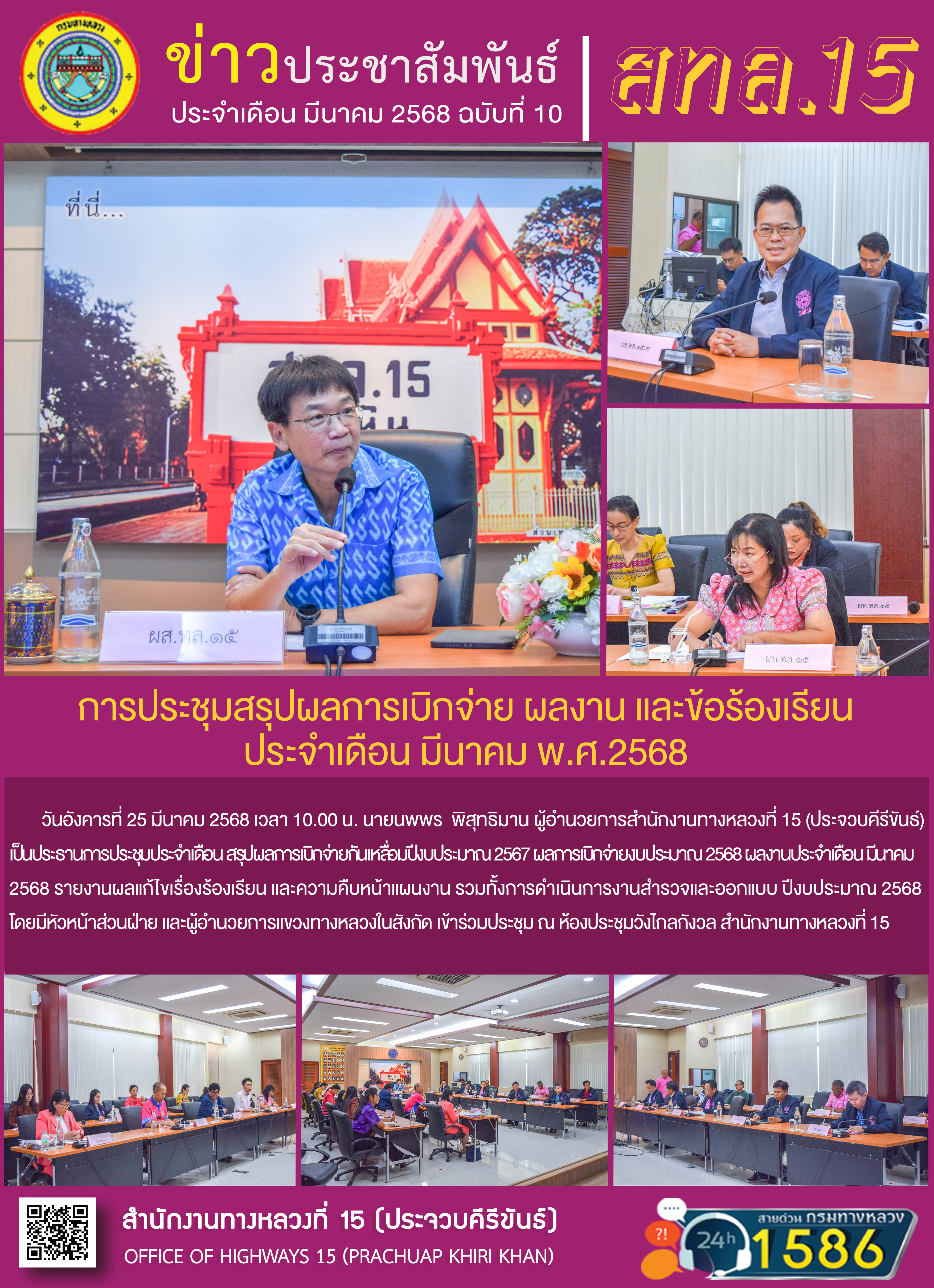 วันอังคารที่ 25 มีนาคม 2568 เวลา 10.00 น. นายนพพร พิสุทธิมาน ผู้อำนวยการสำนักงานทางหลวงที่ 15 (ประจวบคีรีขันธ์) เป็นประธานการประชุมประจำเดือน สรุปผลการเบิกจ่ายกันเหลื่อมปีงบประมาณ 2567 ผลการเบิกจ่ายงบประมาณ 2568 ผลงานประจำเดือน มีนาคม 2568 รายงานผลการแก้ไขเรื่องร้องเรียนและความคืบหน้าแผนงาน รวมทั้งการดำเนินการงานสำรวจและออกแบบ ปีงบประมาณ 2568 โดยมี หัวหน้าส่วนฝ่าย และผู้อำนวยการแขวงทางหลวงในสังกัด เข้าร่วมประชุม ณ ห้องประชุมวังไกลกังวล สำนักงานทางหลวงที่ 15