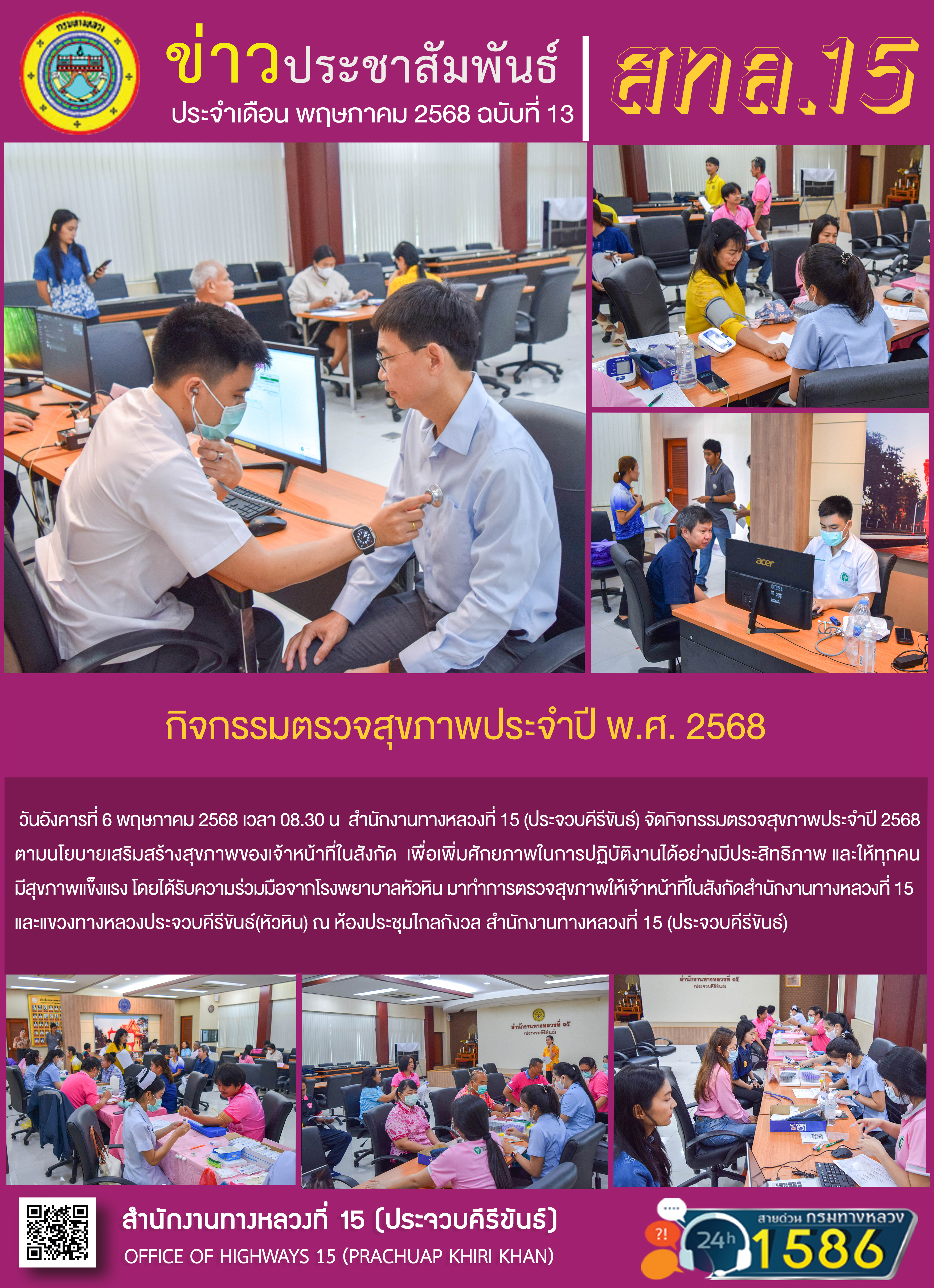 วันอังคารที่ 6 พฤษภาคม 2568 เวลา 08.30 น สำนักงานทางหลวงที่ 15 (ประจวบคีรีขันธ์) จัดกิจกรรมตรวจสุขภาพประจำปี 2568 ตามนโยบายเสริมสร้างสุขภาพของเจ้าหน้าที่ในสังกัด เพื่อเพิ่มศักยภาพในการปฏิบัติงานได้อย่างมีประสิทธิภาพ และให้ทุกคนมีสุขภาพแข็งแรง โดยได้รับความร่วมมือจากโรงพยาบาลหัวหิน มาทำการตรวจสุขภาพให้เจ้าหน้าที่ในสังกัดสำนักงานทางหลวงที่ 15และแขวงทางหลวงประจวบคีรีขันธ์(หัวหิน) ณ ห้องประชุมไกลกังวล สำนักงานทางหลวงที่ 15 (ประจวบคีรีขันธ์)