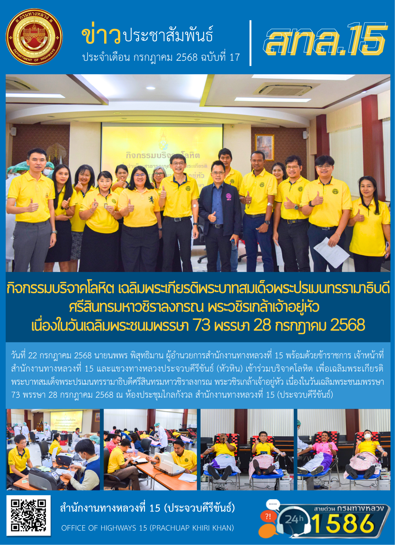 สำนักงานทางหลวงที่ 15 และแขวงทางหลวงประจวบคีรีขันธ์ (หัวหิน) เข้าร่วมบริจาคโลหิต เพื่อเฉลิมพระเกียรติ