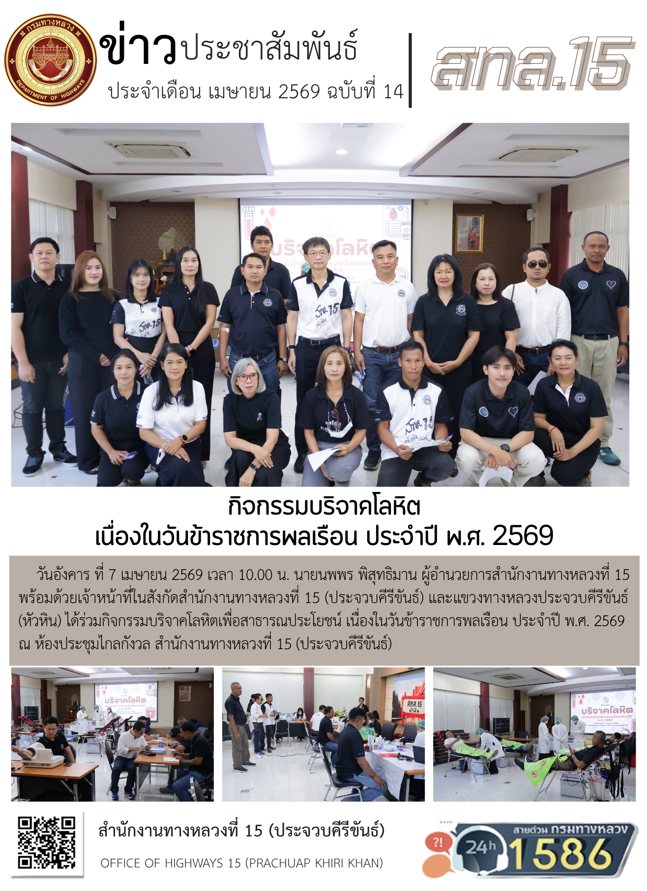 วันอังคาร ที่ 7 เมษายน 2569 เวลา 10.00 น. นายนพพร พิสุทธิมาน ผู้อำนวยการสำนักงานทางหลวงที่ 15 พร้อมด้วยเจ้าหน้าที่ในสังกัดสำนักงานทางหลวงที่ 15 (ประจวบคีรีขันธ์) และแขวงทางหลวงประจวบคีรีขันธ์ (หัวหิน) ได้ร่วมกิจกรรมบริจาคโลหิตเพื่อสาธารณประโยชน์ เนื่องในวันข้าราชการพลเรือน ประจำปี พ.ศ. 2569 ณ ห้องประชุมไกลกังวล สำนักงานทางหลวงที่ 15 (ประจวบคีรีขันธ์)