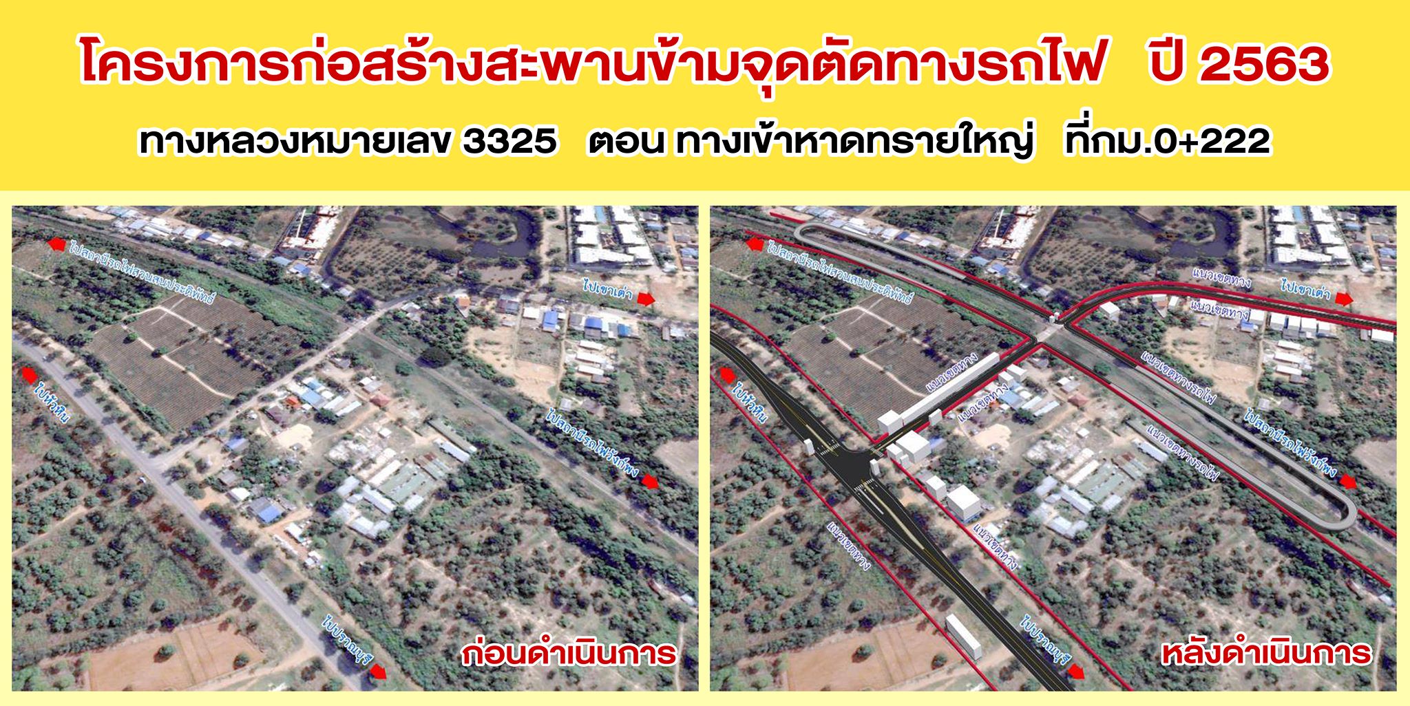 นายนรงฤทธิ์ พรหมประดิษฐ์ ผู้อำนวยการแขวงทางหลวงฯ ,นายเศรษฐ์ จันทอาด รองผู้อำนวยการแขวงทางหลวงฯ ,นายอนุสรณ์ ผาใต้ หัวหน้าหมวดทางหลวงหัวหิน ,นายชัชชัย พงษ์พิทักษ์ ผู้แทนสำนักก่อสร้างสะพาน ,ผู้แทนสำนักสำรวจและออกแบบ ได้ดำเนินการจัดโครงการ การมีส่วนร่วมของประชาชน สำหรับโครงการก่อสร้างสะพานข้ามจุดตัดทางรถไฟ ทางหลวงหมายเลข 3325 ตอน ทางเข้าหาดทรายใหญ่ ที่กม.0+222 ซึ่งได้เชิญผู้นำชุมชน ,ผู้แทนหน่วยงานรัฐและเอกชน ,ประชาชนในพื้นที่ เข้าร่วมรับฟังรูปแบบและการดำเนินงานก่อสร้าง ดังกล่าว โดยมี นายธนนท์ พรรพีภาส นายอำเภอหัวหิน เป็นประธาน ณ อาคารอเนกประสงค์ โรงเรียนเทศบาลบ้านเขาเต่า ต.หนองแก อ.หัวหิน จ.ประจวบคีรีขันธ์
