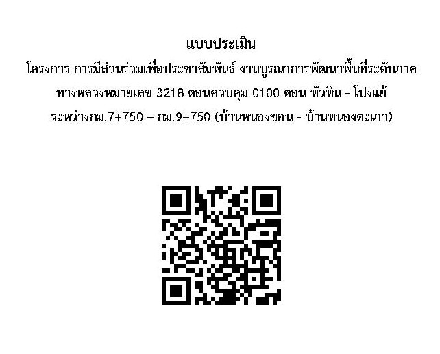 ขอความร่วมมือจากท่าน ร่วมแสดงความคิดเห็นเกี่ยวกับโครงการดังกล่าว โดยการตอบแบบประเมินออนไลน์ผ่านการแสกน QR CODE เพื่อรวบรวมความเห็นของท่านและนำไปปรับปรุงการดำเนินการต่อไป