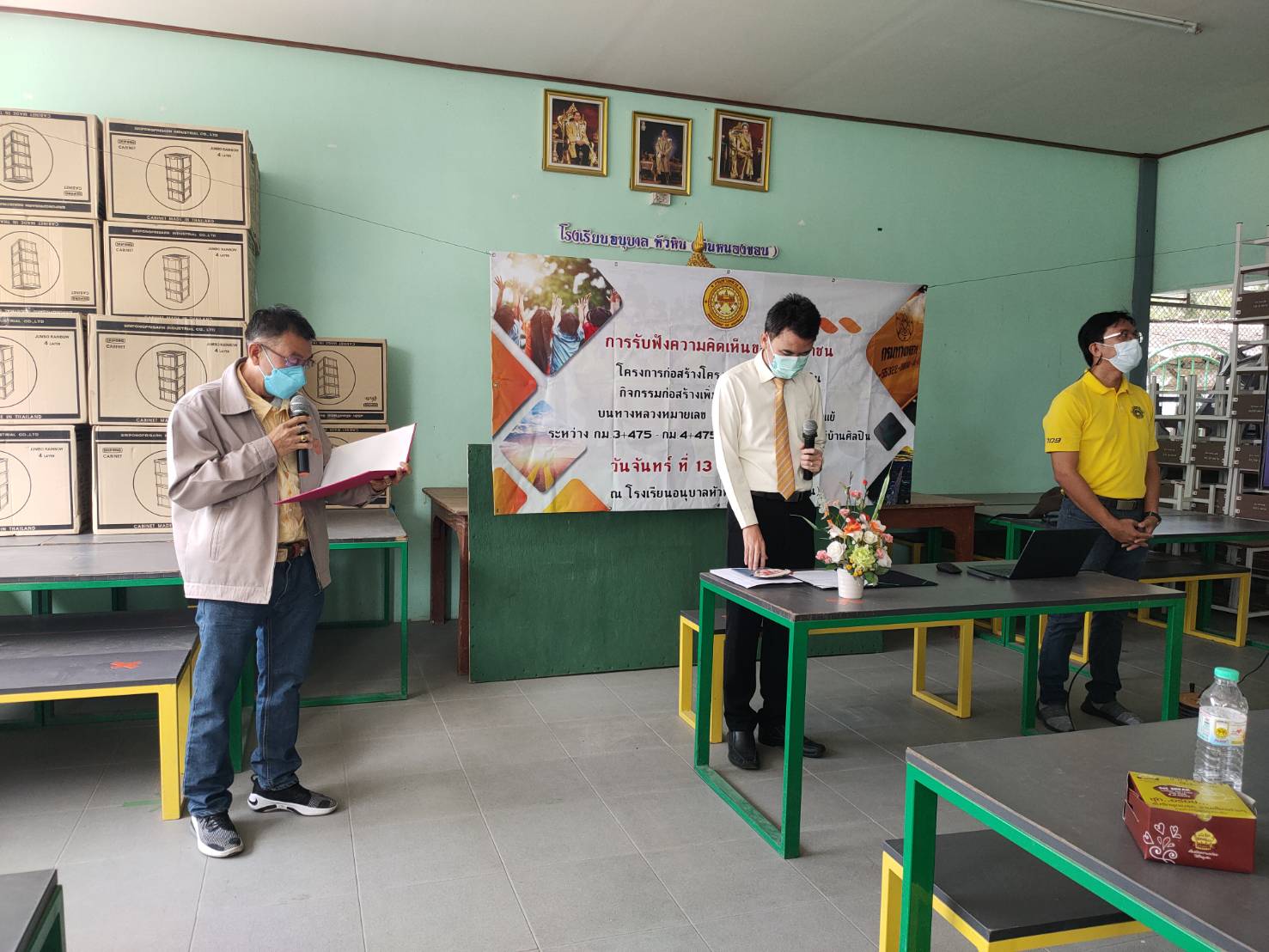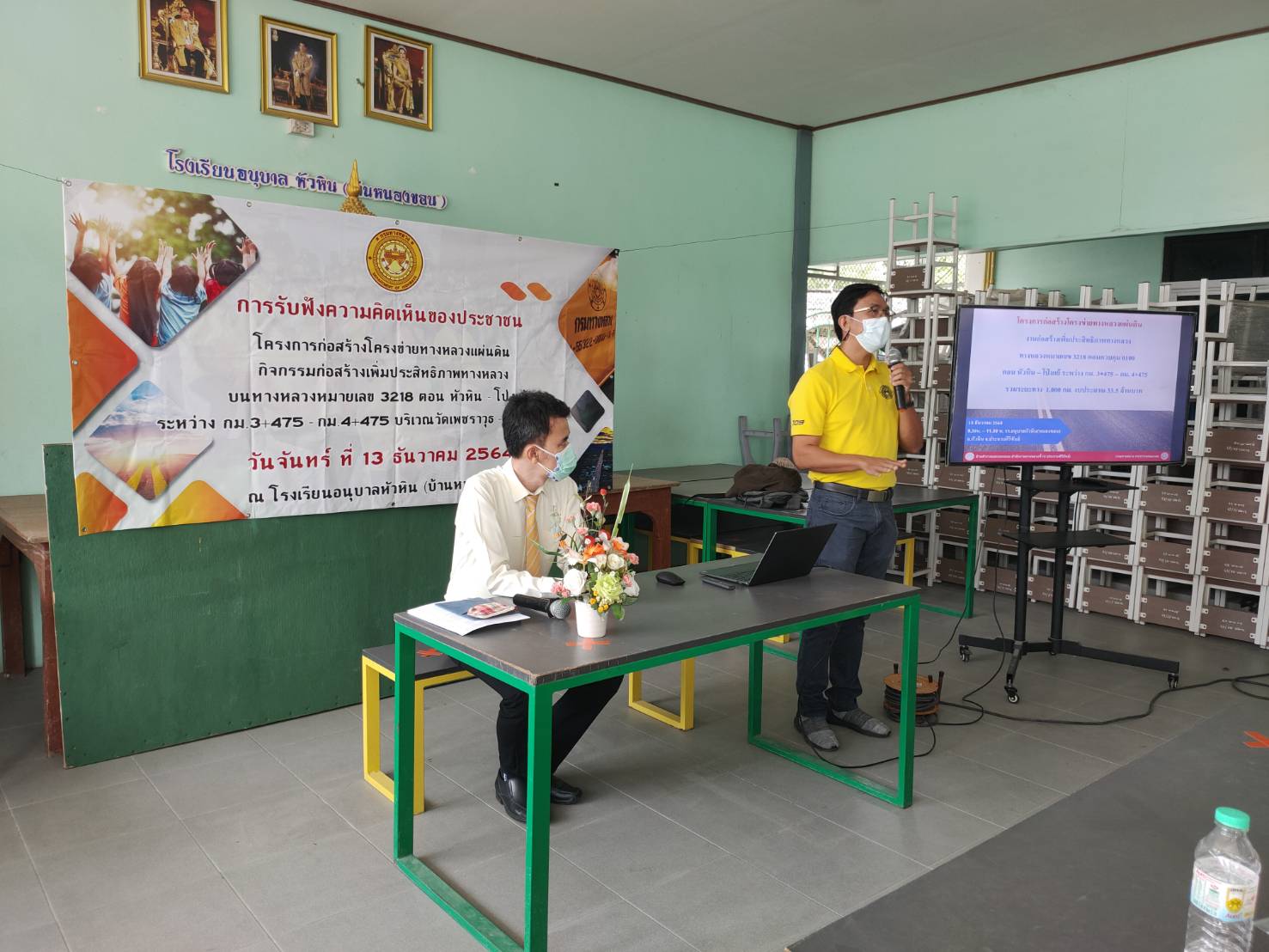 แขวงทางหลวงประจวบคีรีขันธ์(หัวหิน) ดำเนินการโครงการ การมีส่วนร่วมของประชาชน สำหรับโครงการก่อสร้างโครงข่ายทางหลวงแผ่นดิน กิจกรรมก่อสร้างเพิ่มประสิทธิภาพทางหลวง บนทางหลวงหมายเลข 3218 ตอน หัวหิน - โป่งแย้ ระหว่าง กม.3+475 - กม.4+475 บริเวณวัดเพชราวุธ - หมู่บ้านศิลปิน ณ โรงเรียนอนุบาลหัวหิน (บ้านหนองขอน)