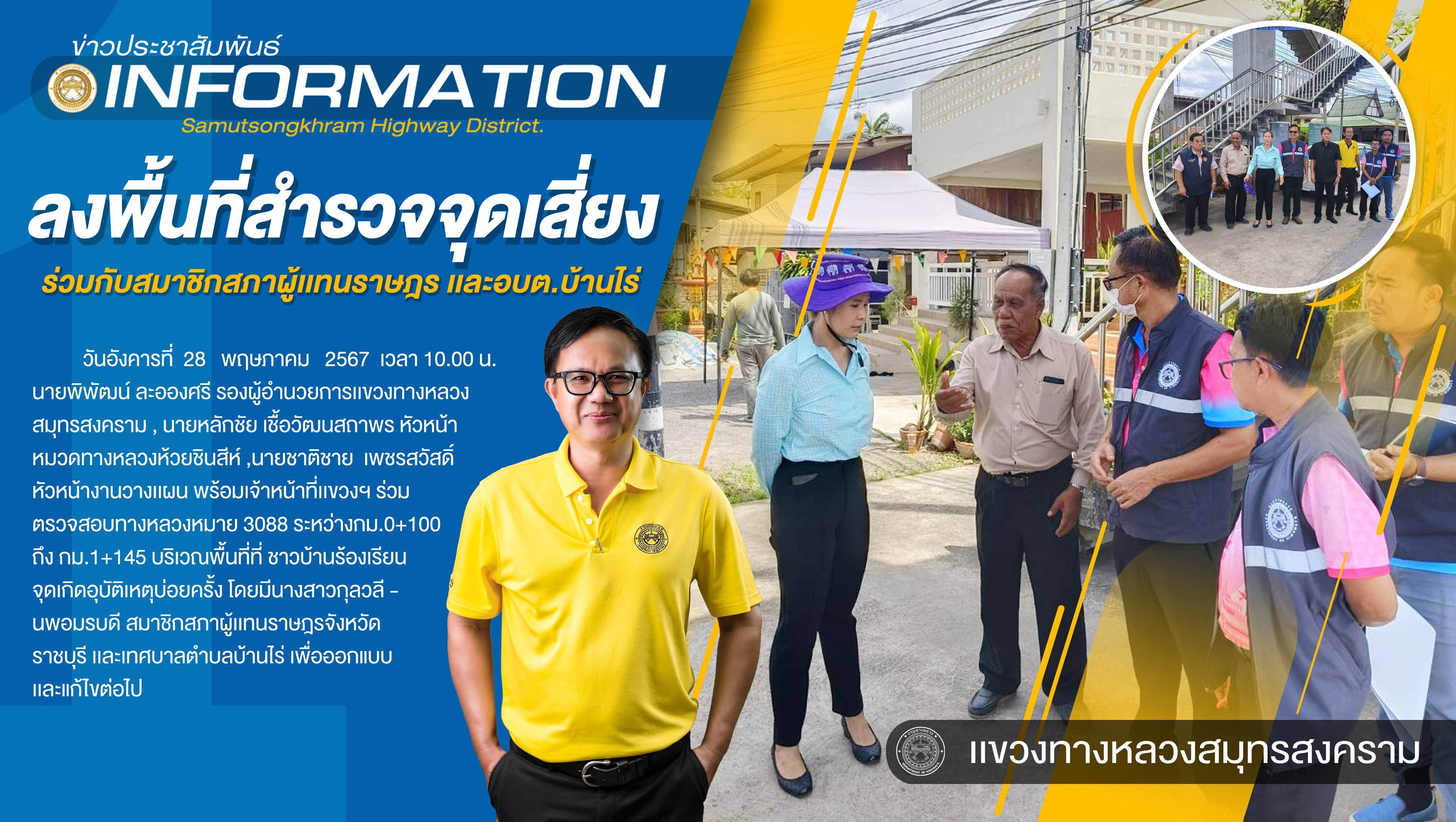 วันอังคารที่ 28 พฤษภาคม 2567 เวลา 10.00 น. นายพิพัฒน์ ละอองศรี รองผู้อำนวยการเเขวงทางหลวง สมุทรสงคราม , นายหลักชัย เชื้อวัฒนสถาพร หัวหน้า หมวดทางหลวงห้วยชินสีห์ ,นายชาติชาย เพชรสวัสดิ์ หัวหน้างานวางเเผน พร้อมเจ้าหน้าที่เเขวงฯ ร่วม ตรวจสอบทางหลวงหมาย 3088 ระหว่างกม.0+100 ถึง กม.1+145 บริเวณพื้นที่ที่ ชาวบ้านร้องเรียน จุดเกิดอุบัติเหตุบ่อยครั้ง โดยมีนางสาวกุลวลี - นพอมรบดี สมาชิกสภาผู้เเทนราษฎรจังหวัด ราชบุรีี เเละเทศบาลตำบลบ้านไร่ เพื่อออกแบบ เเละแก้ไขต่อไป
