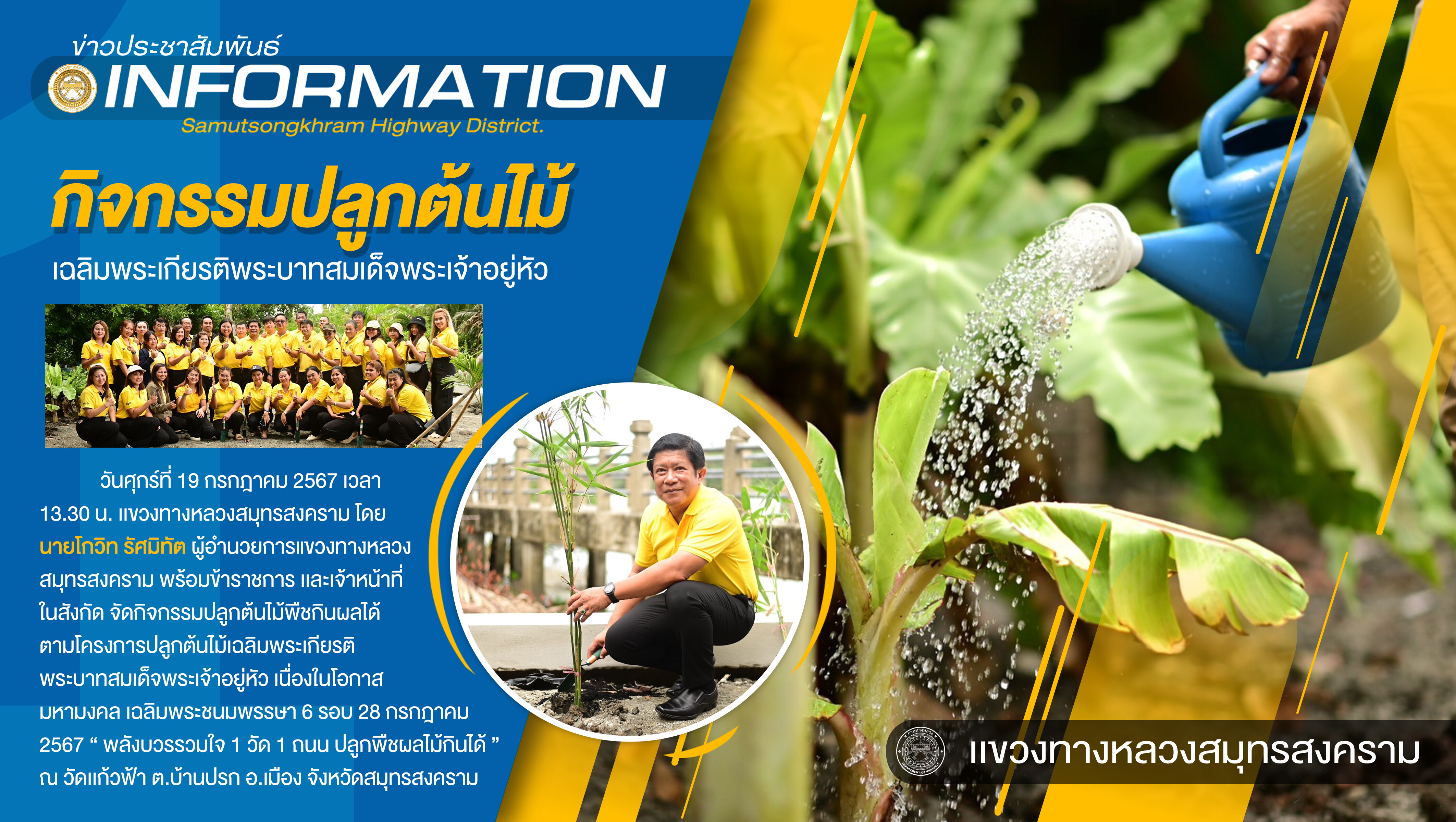 วันศุกร์ที่ 19 กรกฎาคม 2567 เวลา 14.30 น. เเขวงทางหลวงสมุทรสงคราม โดย นายโกวิท รัศมิทัต ผู้อำนวยการแขวงทางหลวงสมุทรสงคราม พร้อมข้าราชการเเละเจ้าหน้าที่ในสังกัด จัดกิจกรรมปลูกต้นไม้พืชกินผลได้ตามโครงการปลูกต้นไม้เฉลิมพระเกียรติพระบาทสมเด็จพระเจ้าอยู่หัว เนื่องในโอกาสมหามงคล เฉลิมพระชนมพรรษา 6 รอบ 28 กรกฎาคม 2567 “ พลังบวรรวมใจ 1 วัด 1 ถนน ปลูกพืชผลไม้กินได้ ” ณ วัดเเก้วฟ้า ต.บ้านปรก อ.เมือง จังหวัดสมุทรสงคราม